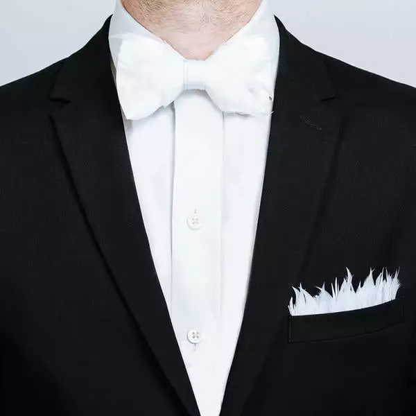 Product Details | The Carew bow tie is made with all white Goose feathers. A special technique gives this tie a slightly ruffled look, adding interest, depth and dimension. Wear with the Carew Pocket Square for a truly sophisticated look.
