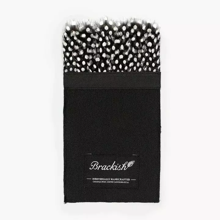 Our Guinea pocket square is crafted with charcoal grey and white guinea feathers.