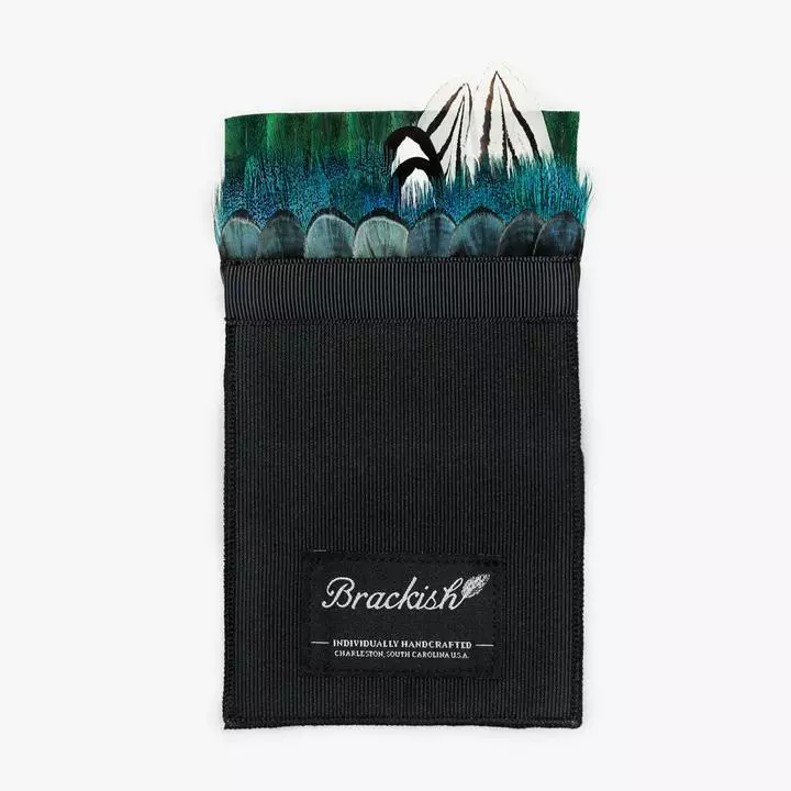 Gaboon is crafted with emerald green and royal peacock, navy, black and white pheasant feathers.