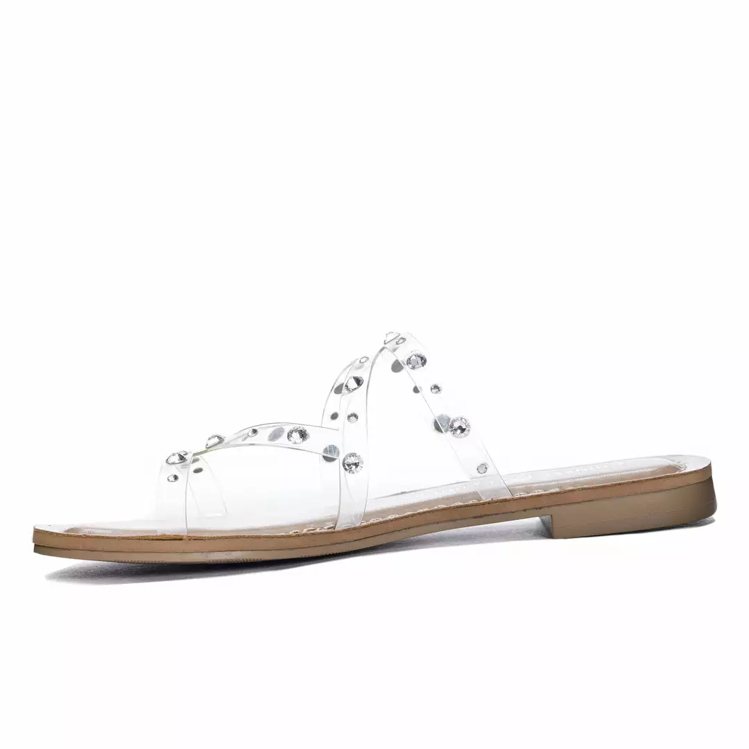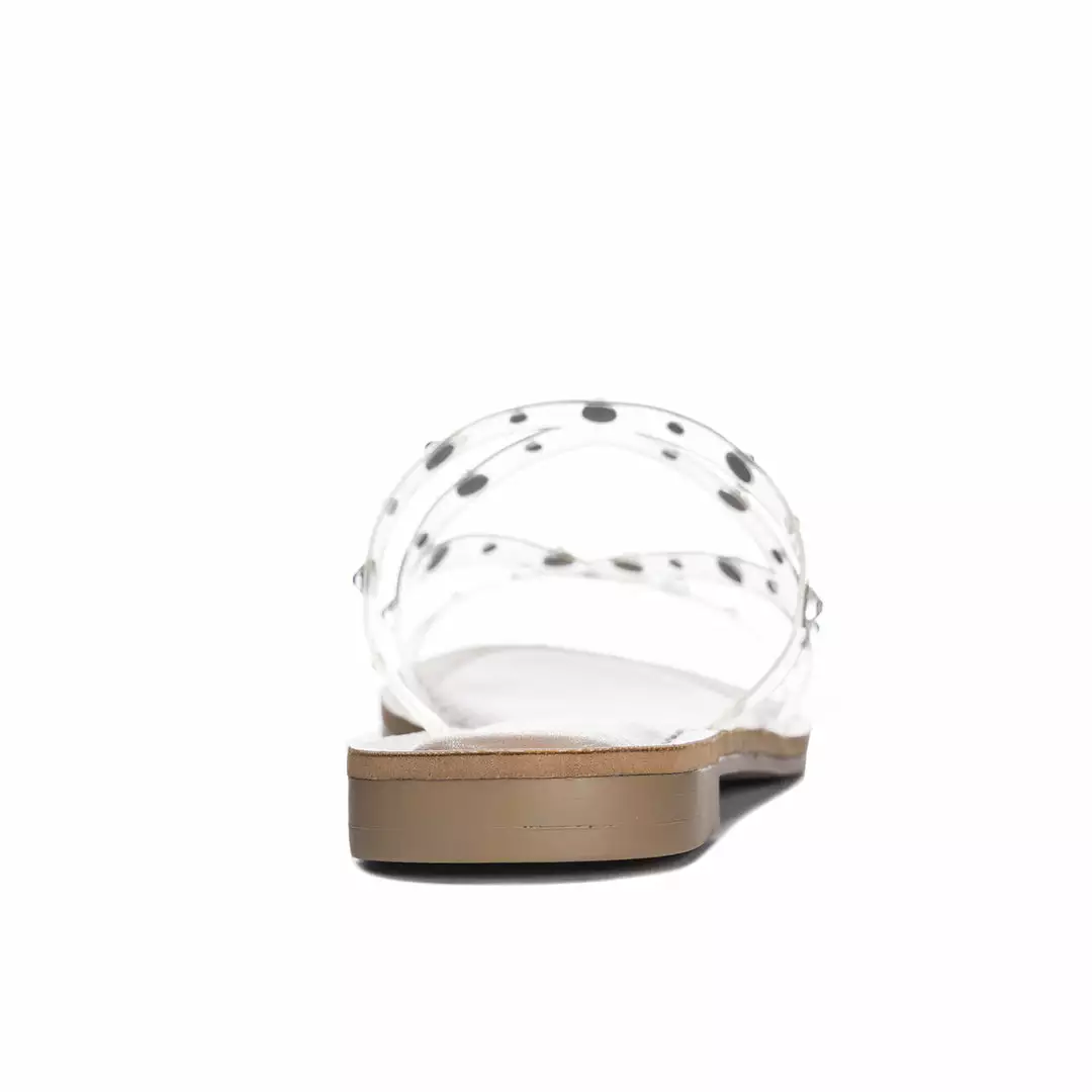 This playful slide sandal with a lightly padded footed features glinting rhinestones on the straps that put some shine in your step.
