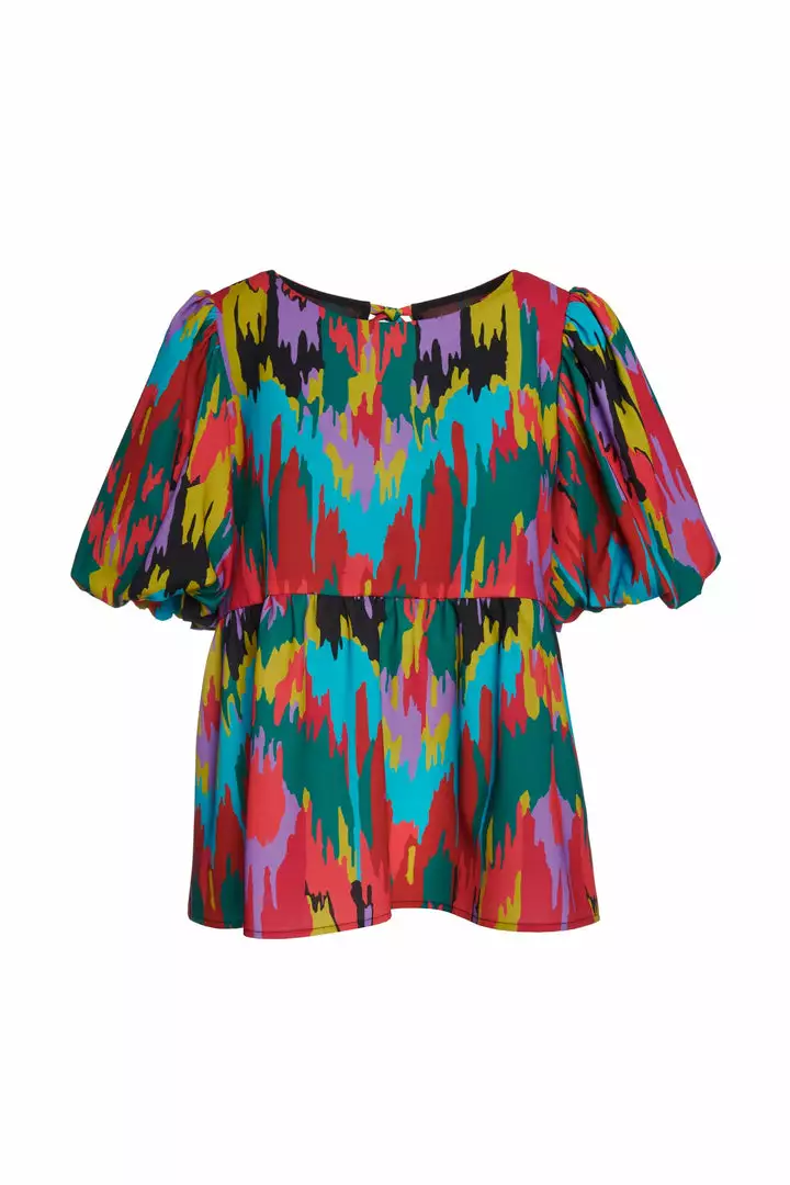 This fun top is sure to make a statement with your favorite pair of jeans! Featuring a babydoll silhouette with bubble sleeves and tie closure in the back.