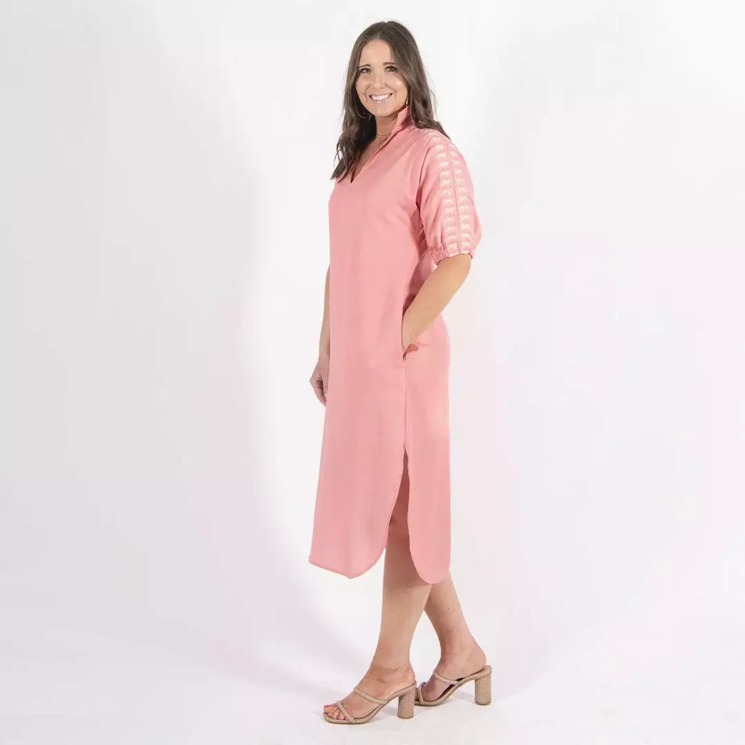 Our best-selling Poppy Dress now lengthened into a Poppy Caftan! This style is casual enough for a day at the beach but dressy enough for drink. This exclusive Sugar Coral color is complimented by fine embroidery detailing along the shoulder seam. Our signature Tiger is hand designed by Emily in our Savannah studio. Loose-fitting with an optional stand up collar.