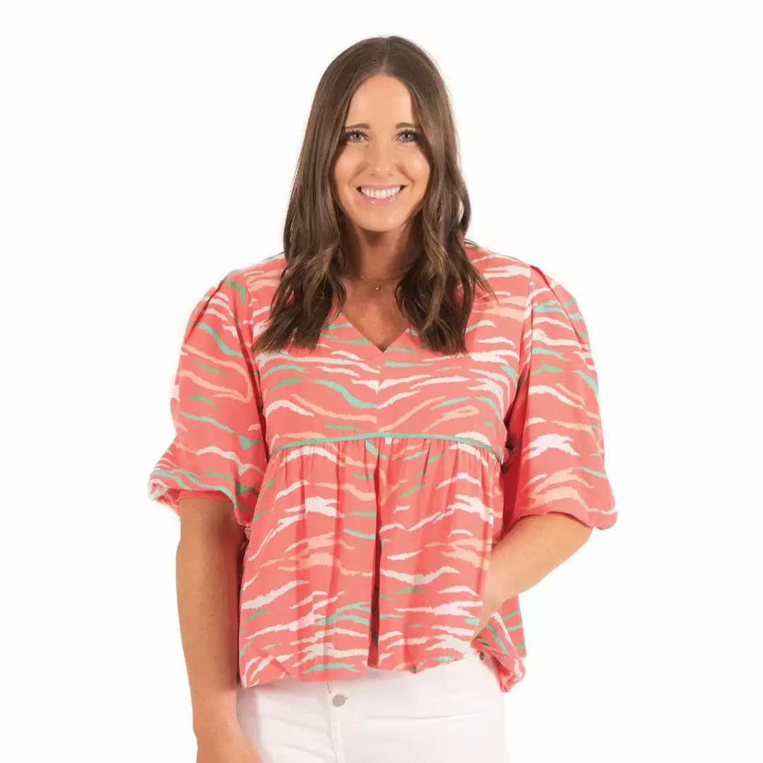 Feminine and Fun Rosie is the new ‘it girl’ top for this Spring! This style is an easy popover in our signature Tiger print, featuring a ruffled empire waist and bubble sleeves with elastic cuffs. Easy and casual, this top is perfect for all of your activities! Paired with denim shorts, or white jeans this blouse will have you dreaming of a Spring time breeze.Â