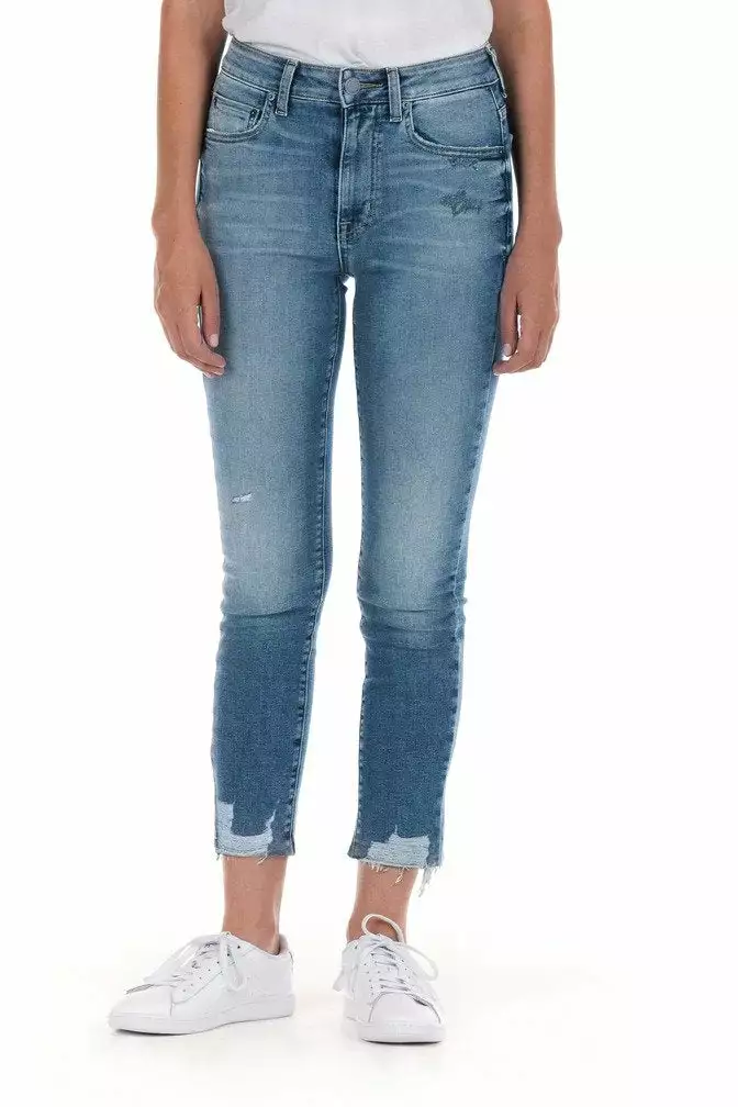 Our popular high-rise cropped skinny in this yummy light blue wash will be your new go to. An unfinished hem and slight rips and chews on the hip and pocket give this denim character and charm. Hand crafted from Liberty Denim you get a true denim look with a soft stretchy fabric for comfort.