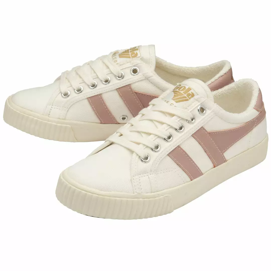 Gola Classics introduces Tennis Mark Cox. Based on an original Gola style from 1975 that was worn by tennis player Mark Cox, Tennis truly embraces Gola’s long history with racquet sports. This ladies tennis inspired plimsoll features an off white upper, with a contrasting chalk pink wingflash. Gold Gola branding can be seen on the tongue and heel-turn. This style also comes in off white/navy, off white/green mist and off white/violet.