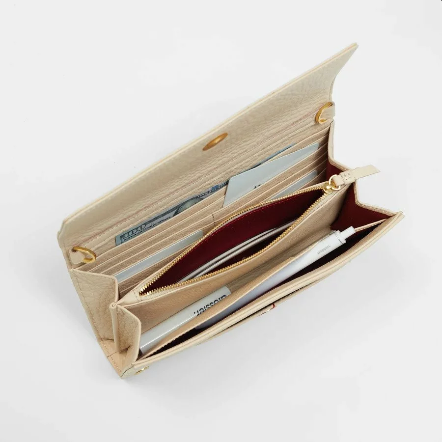 A new addition to our selection of structured styles, AJ looks sleek as a special event clutch or crossbody wallet, designed with a removable strap and organization in mind.