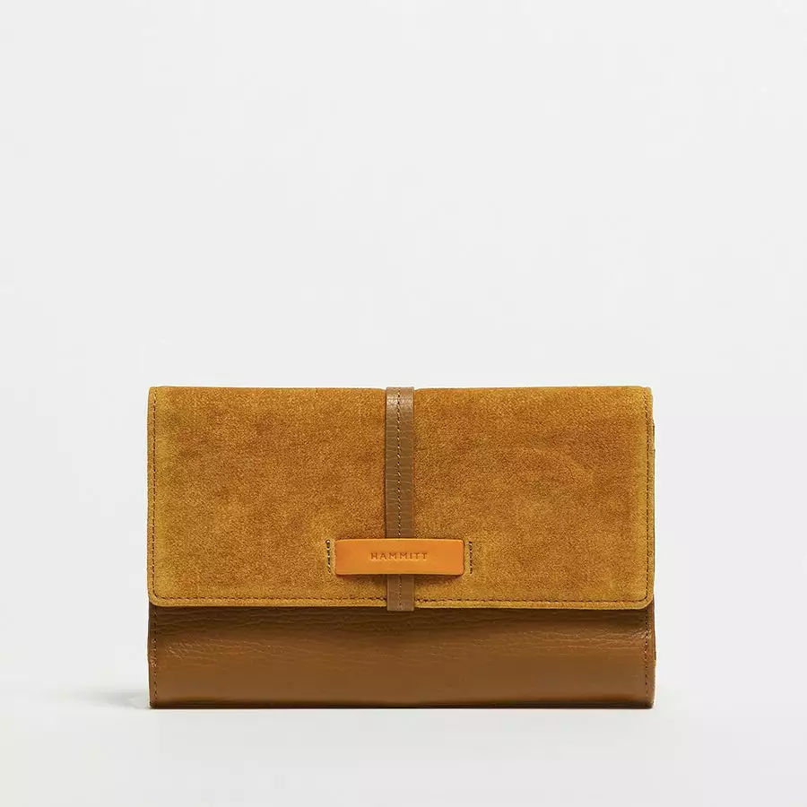 - Crafted with a high-shine golden-brown leather and Italian suede, with a third leather accent