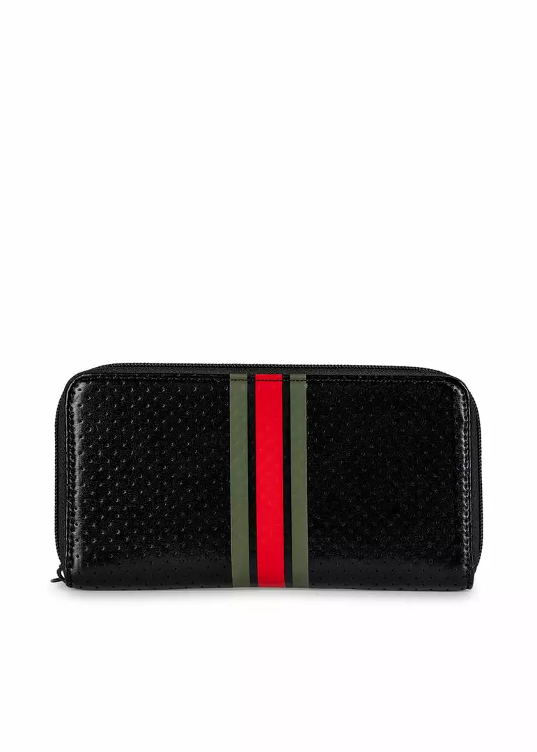 Full size zip around wallet featuring 2 bill slots, 1 zip change slot and 10 card slots.