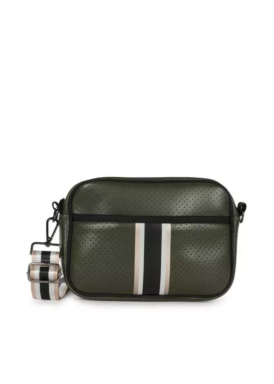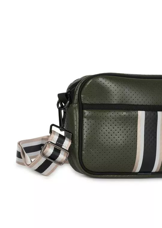 Neoprene compact crossbody bag with hidden front zipper compartment