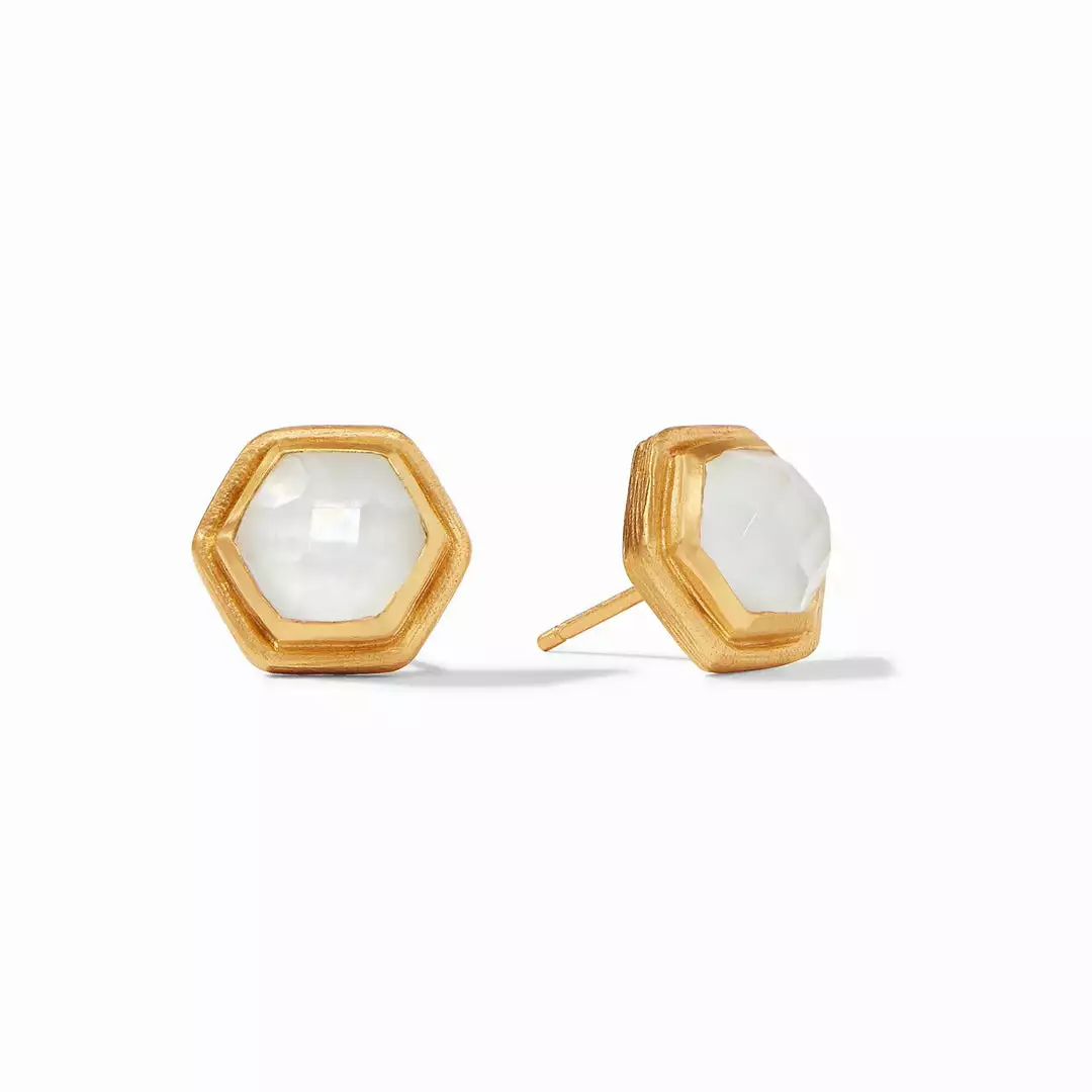 Radiant rose cut gemstone of imported glass set in an elegantly scored golden geometric surround.