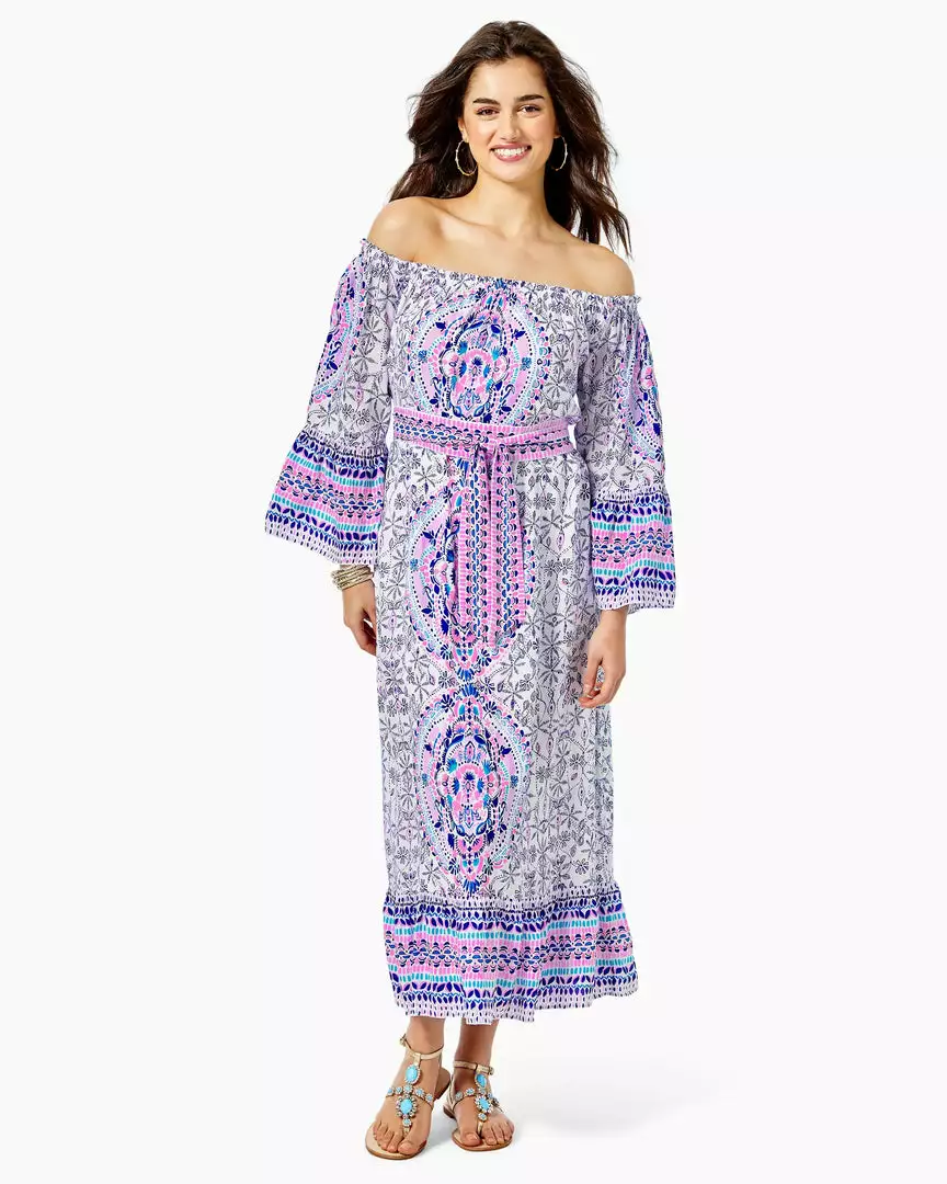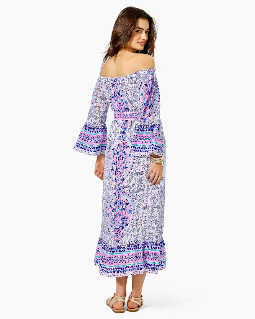 Bohemian aesthetic meets Lilly chic in our showstopping Abigale Midi Dress. The easy-fit silhouette shows off an off-the-shoulder neckline, long ruffled sleeves, and a ruffle at the hem of the midi-length skirt. A self sash cinches the whole gorgeous design together. It’s easy to look fab from sun-up to sundown in this delightful dress.