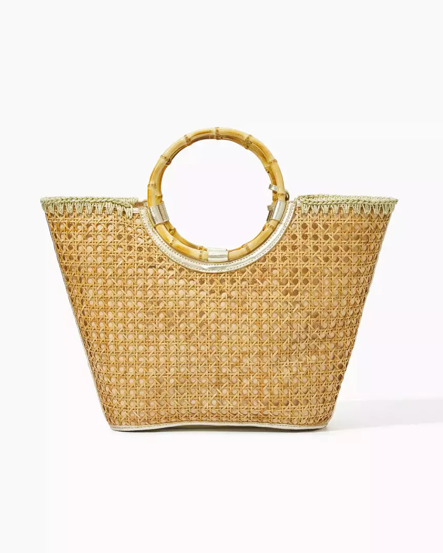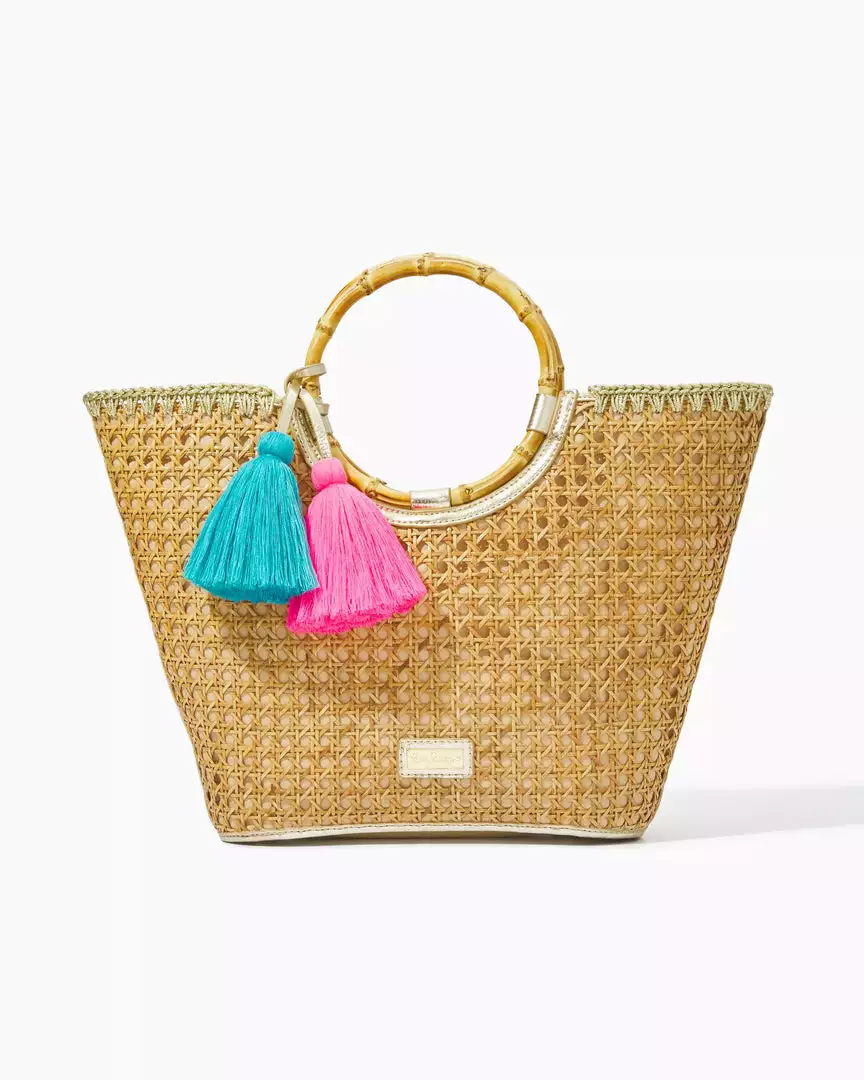 Our Grotto Cane Tote is made from natural cane with bamboo top handles. Gold embroidery whip-stitching lends an extra bit of shine, while colorful hanging tassels make this bag really stand out. For shopping at home or going on adventures while in paradise, this tote is the perfect carry-all.