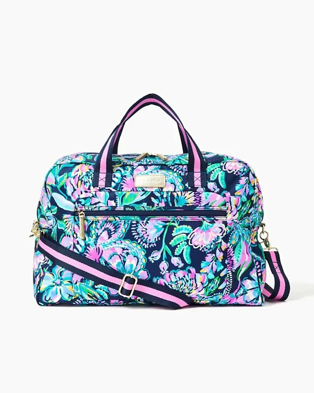 When a weekend getaway is in the plans, be sure and grab our Beale Weekender Bag. Generous in size and bright with print, this must-take carry-all is fashioned from matte poly fabric and accented by striped, webbing details. Stylish and spacious, you won’t want to leave without it.