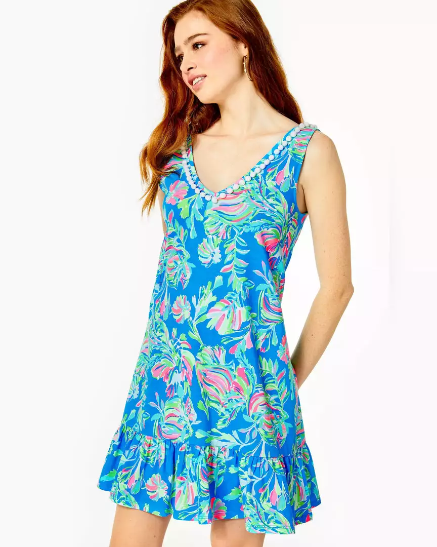 Short and oh-so-sweet, our Camilla Swing Dress features a swing fit silhouette complete with fun designer details like tiered ruffles at the hem and a v-neckline with a pom-pom trim. Embellished by a vibrant Lilly print, this dress is one you’ll reach for again and again.