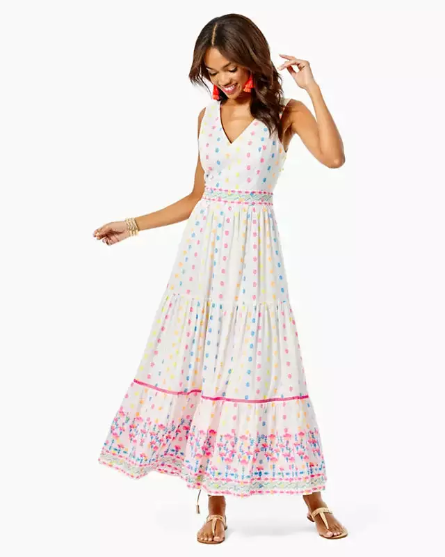 Spotted! Our gorgeous Charleen Maxi Dress ready for summer fun. Fitted at the top with a V-neckline, bodice cups, and generous straps, it cinches at the waist leading to a lush tiered skirt with pop-color trim and embroidery. The bright tropical-inspired beauty of the colors is enlivened by the texture of the tiers, which sway with movement.