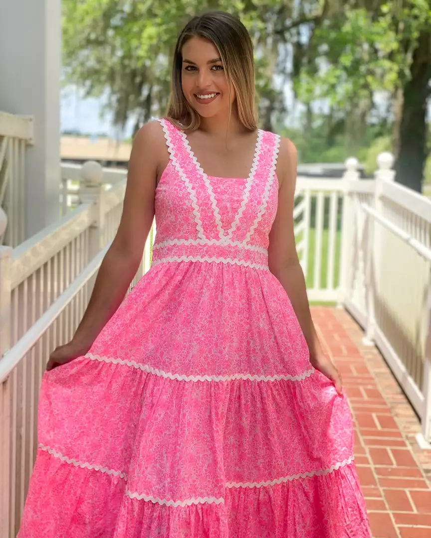 Crisp and cool in printed cotton voile, the Pollie Midi Dress is a fit-and-flare midi with a tiered skirt. Its sleeveless silhouette is accented by side seam pockets, a smocked back panel, and charming ric rac trim at the bodice, straps, and skirt.
