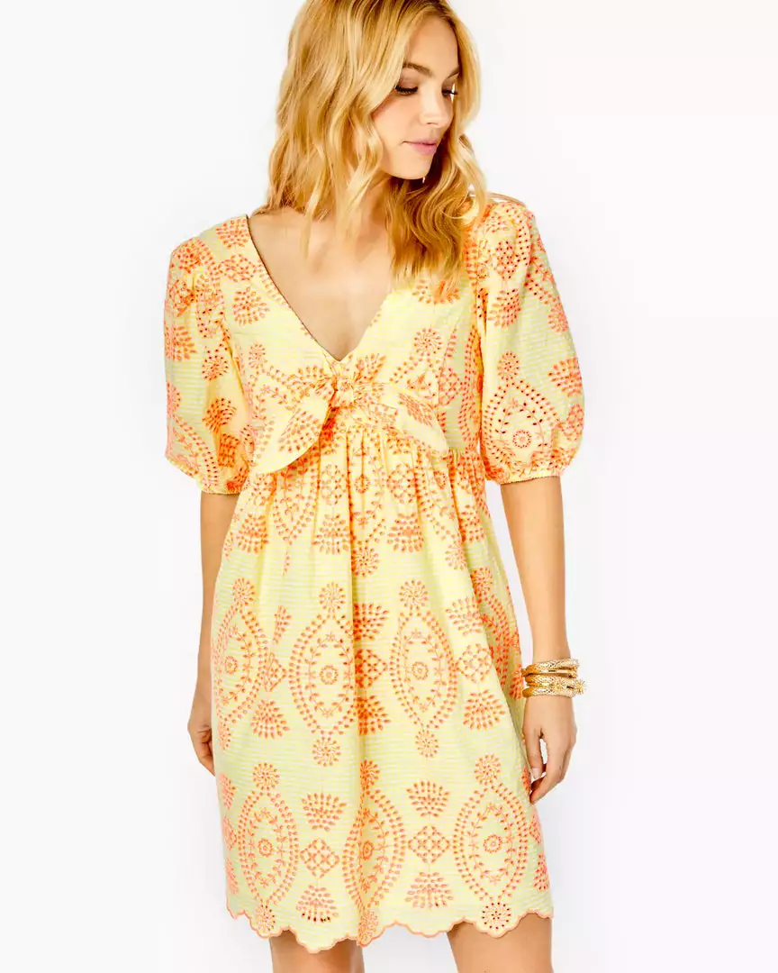 The bright and beautiful Sarafina Eyelet Babydoll Dress is sure to stand out for summer’s gatherings and getaways thanks to its vibrant gingham seersucker eyelet fabric. This v-neck babydoll dress features a tie-front bodice, short puff sleeves, and a scalloped hem for an on-trend silhouette.