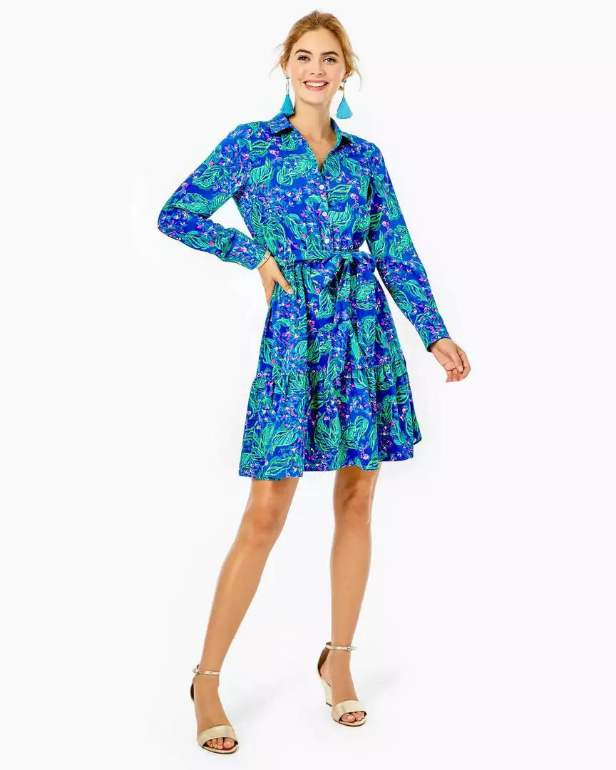 Offering a classic shape with lots of movement, our Eilenne Shirtdress is sure to be a closet staple. The easy-fit silhouette features long sleeves, elastic at the waist, a ruffled hem, side seam pockets, and a separate sash.