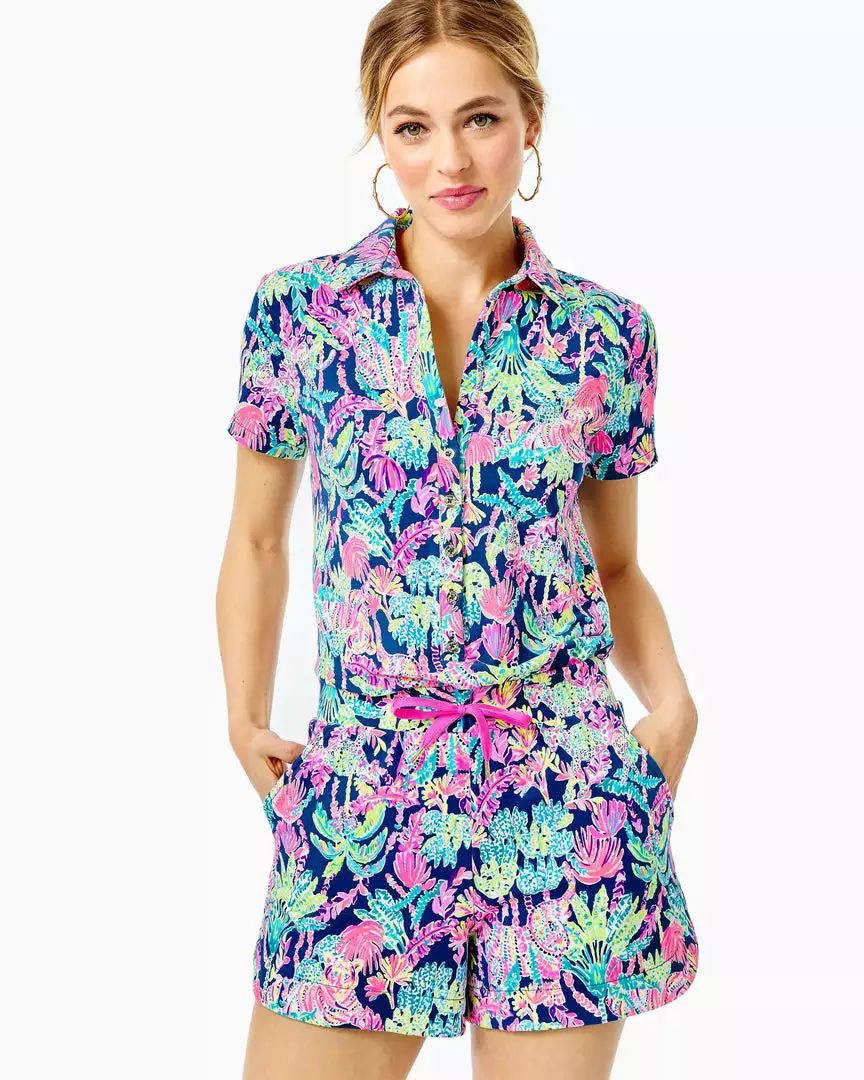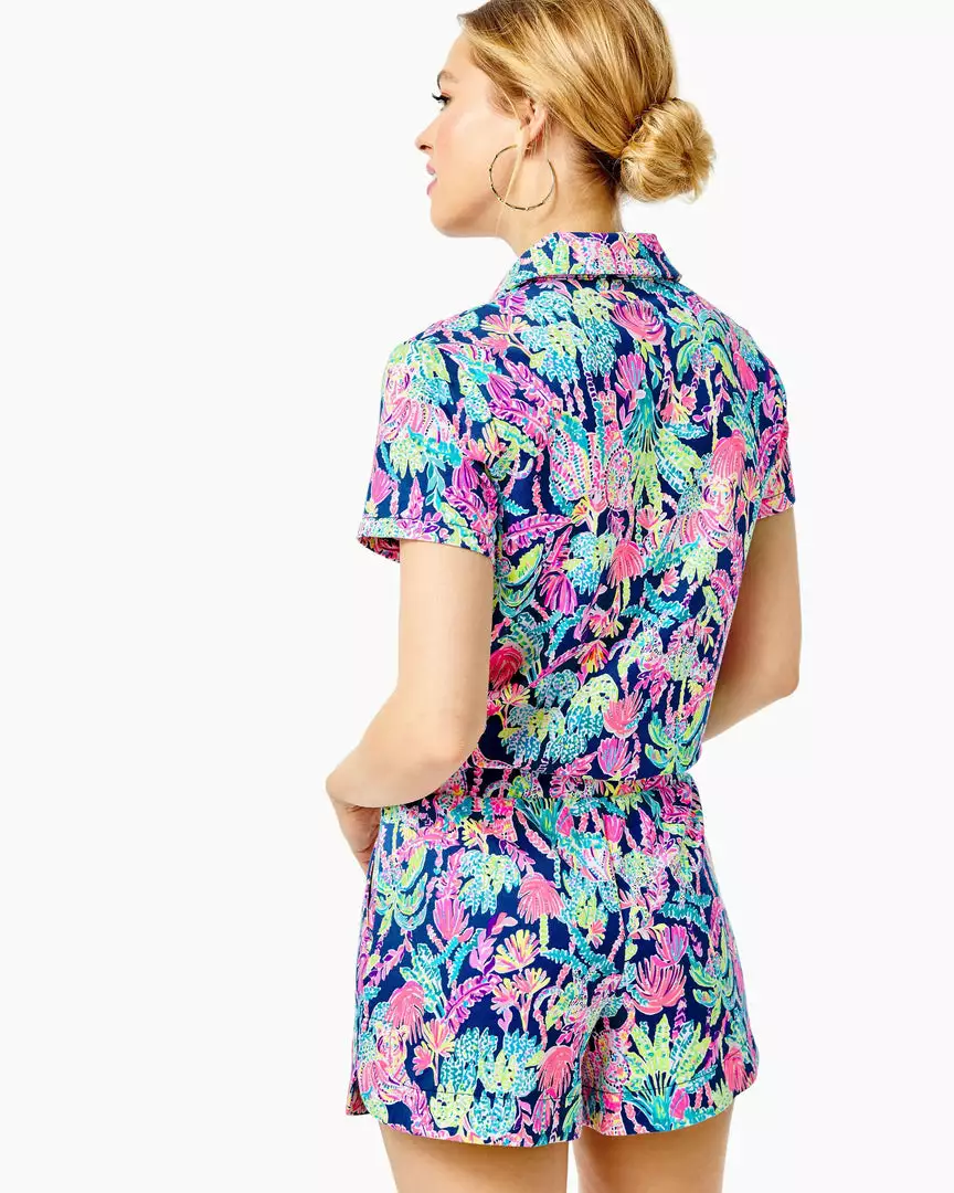 A chic mix of a button-down shirt and shorts combine to fashion our Jorgie Terry Romper. The luxe terry fabric is lightweight and luxurious, while a vibrant Lilly print gives this romper even more fun flair. This chic romper is ideal for sips in the twilight or even a sunny day of adventure.