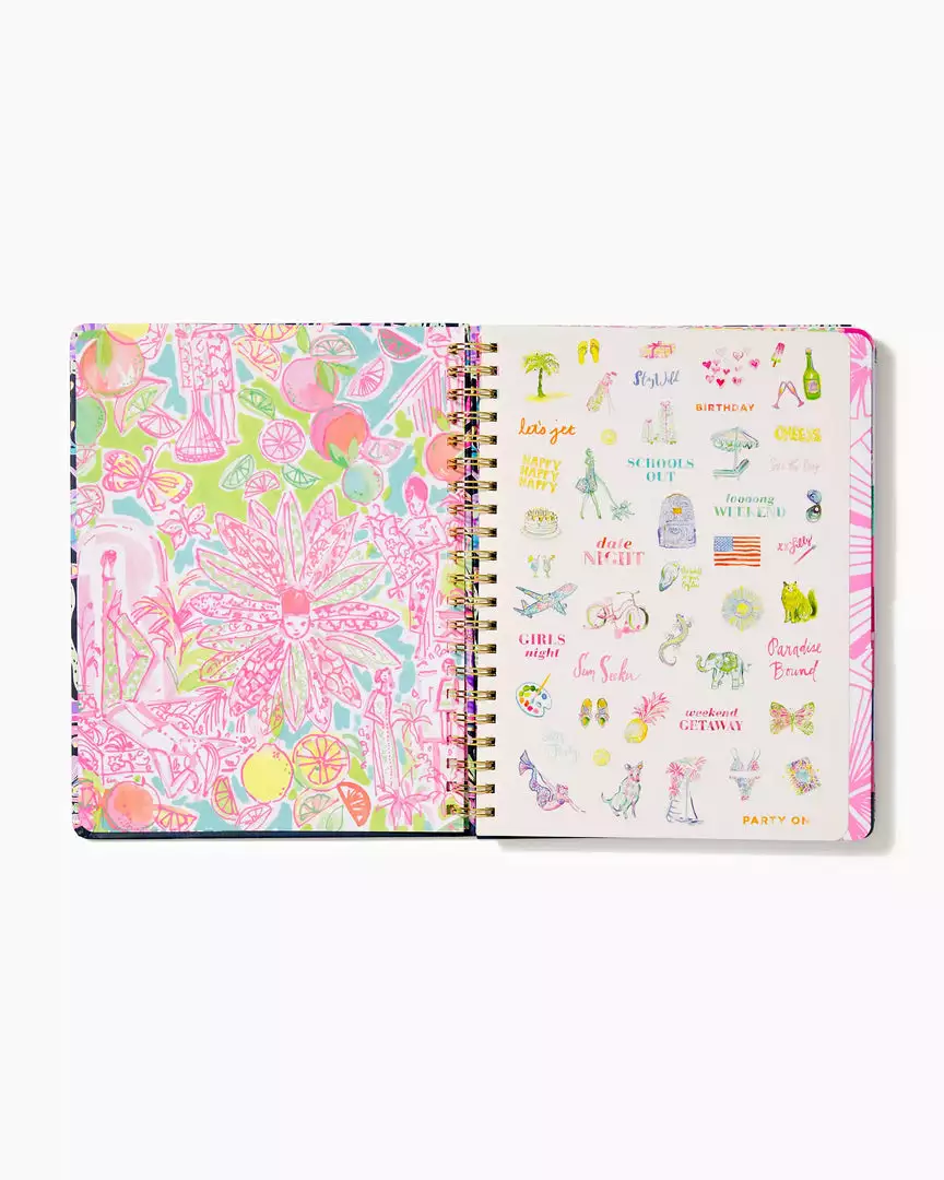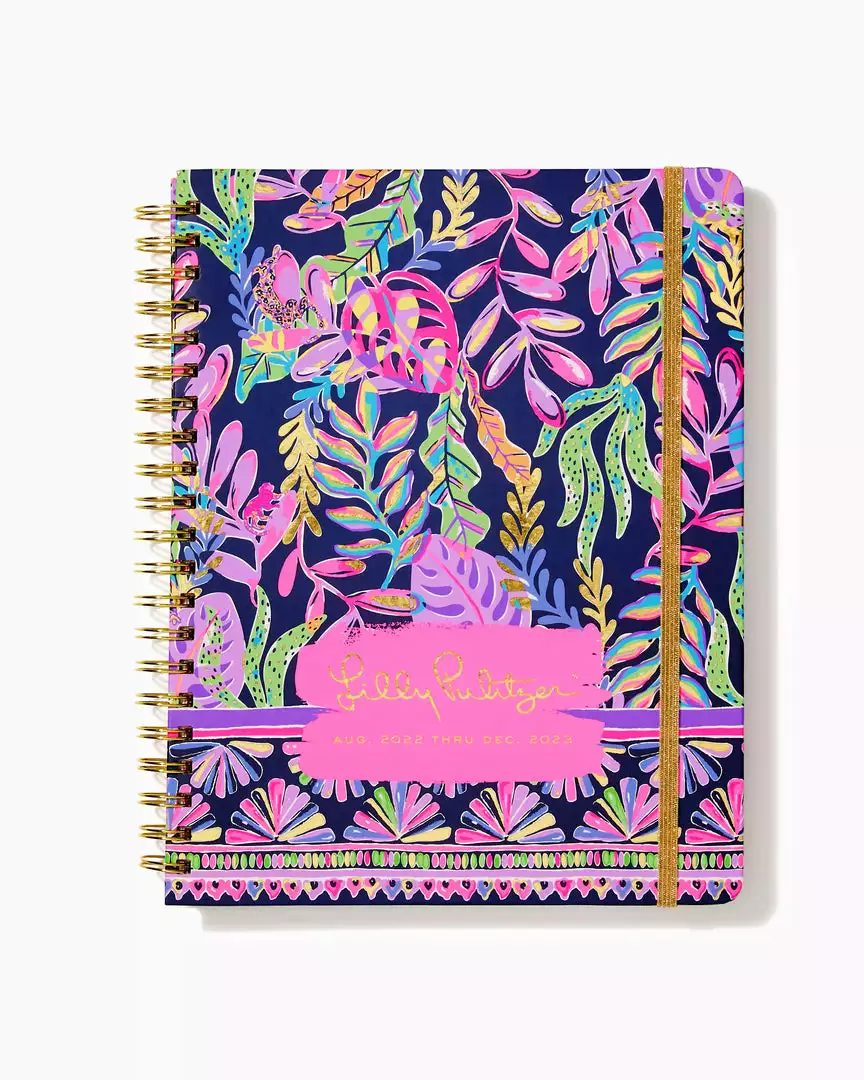 Make plans in print with our August 2022 – December 2023 Jumbo Agenda. It features 17 months of monthly and weekly views for keeping track of every vacation, appointment, playdate, date night, and brunch with your BFFs. Even better, it’s delightfully designed with two sticker pages, handpainted art interiors, a reinforced double-sided interior pocket, tabs, gold elastic band closure and spirals, and pages of colorful prints.