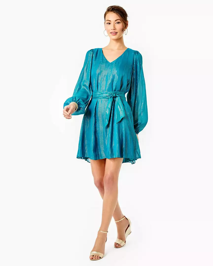 Our Kalianna Swing Dress is a perfect choice for this season’s festive soirees. Its swing fit is made for movement, with a V-neck, panel seams, a separate sash, and long, full sleeves that have a lovely puffy look all their own. Subtle metallic stripes accent the viscose fabric for a final touch of shine.