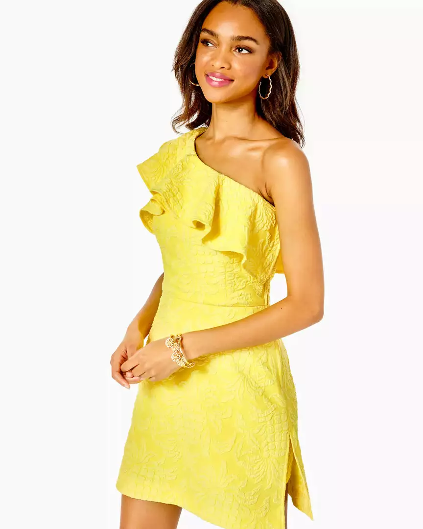 Make a style splash wherever you go in our sensational Kipton One-Shoulder Romper. This fresh look features a one-shoulder neckline, flounce details, and a skirt with side slits. The final delicious detail? A pucker jacquard fabric that has a delightful pineapple design. This look is the perfect mix of fun and fashion.