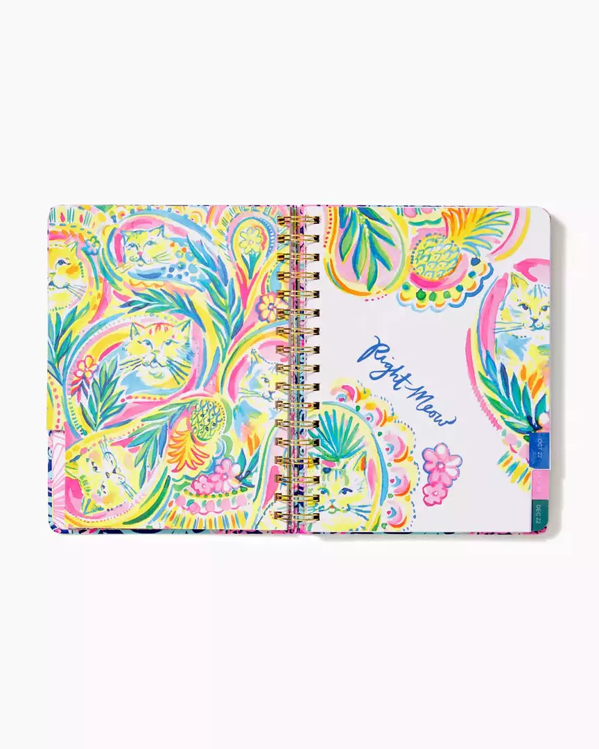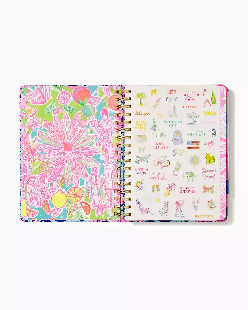 Make plans in print with our August 2022 – December 2023 Large Agenda. It features 17 months of monthly and weekly views for keeping track of every vacation, appointment, playdate, date night, and brunch with your BFFs. Even better, it’s delightfully designed with two sticker pages, handpainted art interiors, a reinforced double-sided interior pocket, tabs, gold elastic band closure and spirals, and pages of colorful prints.