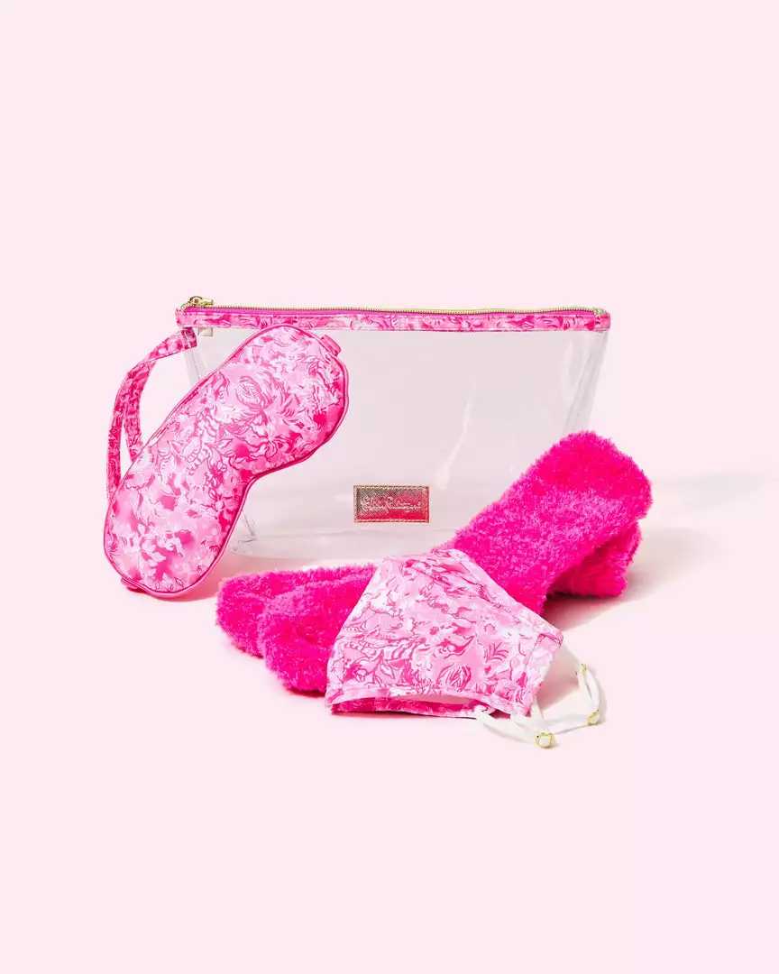 - Clear pvc zip pouch with printed trim, fitted PPE face mask, eye mask and chenille socks.