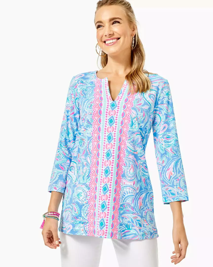 Our Karina Tunic is a great top for wearing in the sun. Styled in our lightweight Chillylilly fabrication with UPF 50+ sun-protection, this top keeps you cool by wicking moisture away from your body. It also shows off one of our bright masterpiece prints that’s engineered to fit perfectly on the long sleeves and extra length. Chainstitch detailing at the neckline completes this paradise-perfect style.