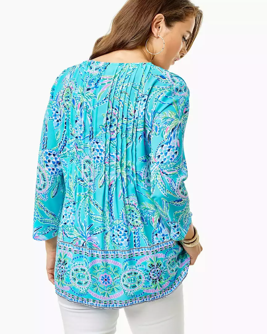 The flowy shape of our Marilina Tunic Top brings you the comfort you crave, while also showing off designer details that let everyone know you’re wearing Lilly. A notched neckline, self drawcord with tassels, and pintuck detail at the front and back give the loose shape lots of style, while the engineered Lilly print wows with bright colors and a breathtaking design.