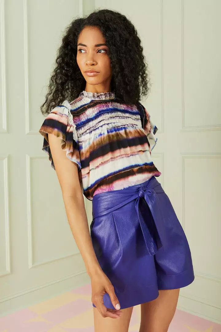 The Pixie is all about texture and color. This soft vegan leather short in bright indigo is worn high and cinched at the waist to create an oh-so-flattering silhouette. The vegan leather’s subtle stretch means the short is as comfortable as it is stylish. Styled here with our Sami blouse.