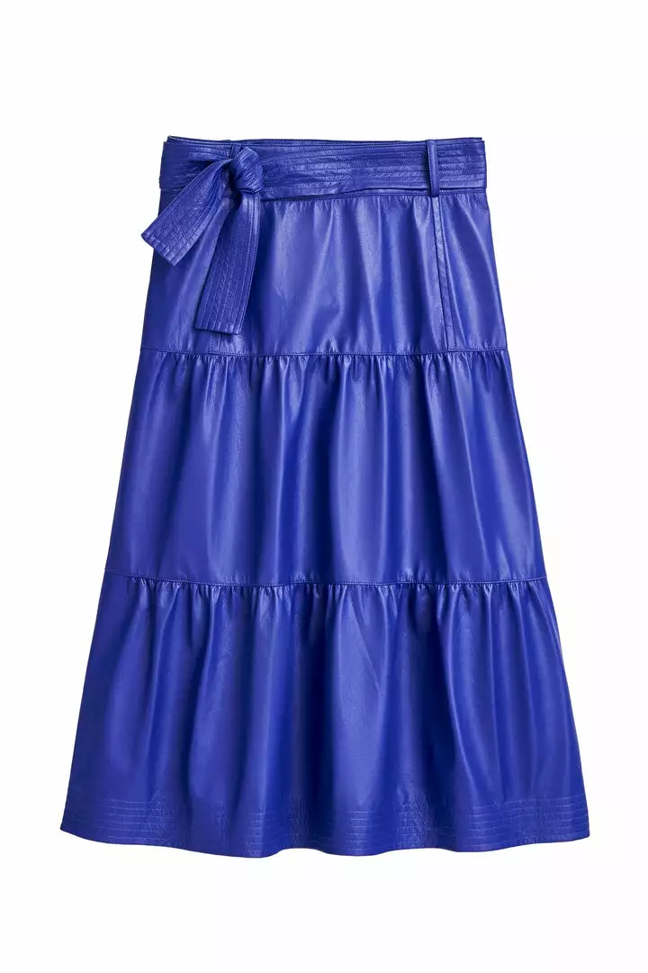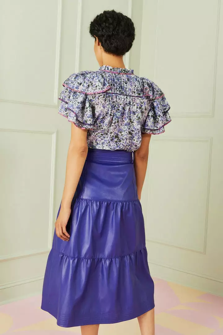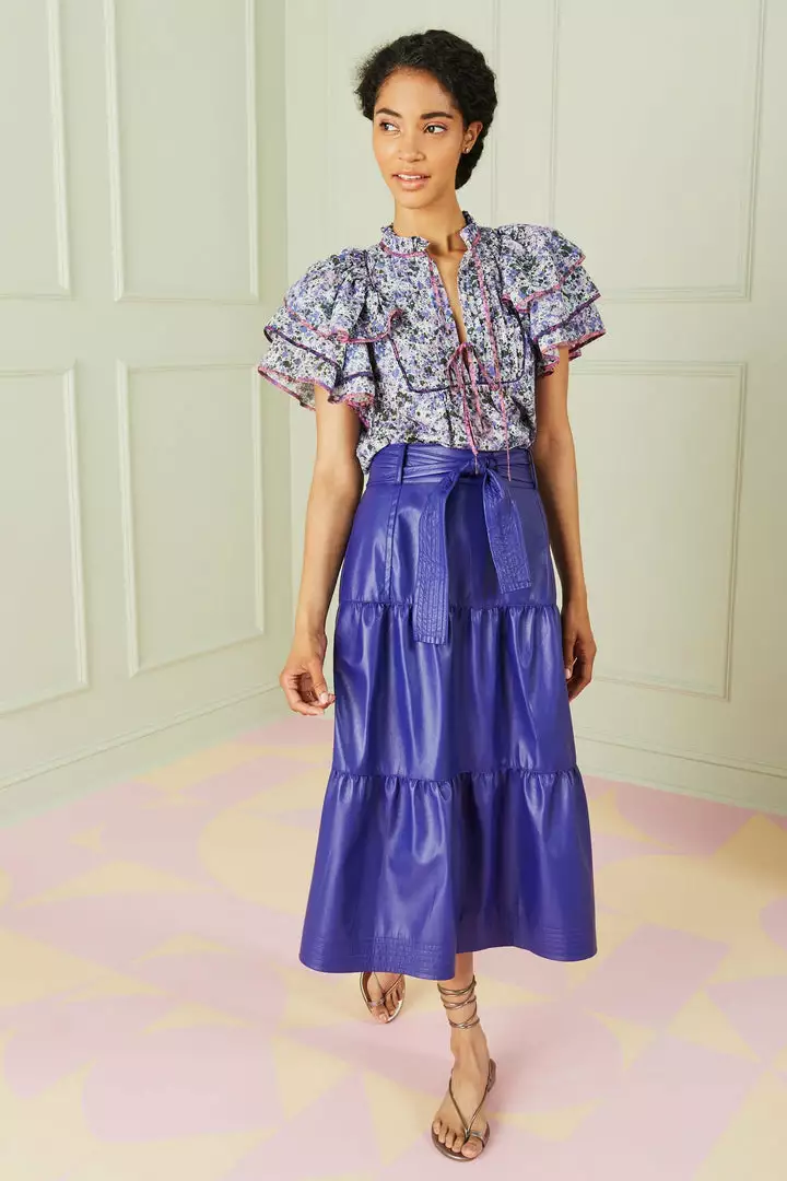 Our three-tier, high-waisted Brooklyn skirt is made from an indigo vegan leather that reads somewhere between blue and purple. We’re particular fans of the scene-stealing midi skirt when paired with Marie Oliver’s Phoebe and Reese tops in our complimentary Seastone and Dapple Mix prints.