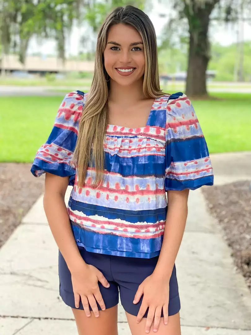 If you can’t decide what to wear to that Memorial Day cookout or Fourth of July picnic, Dani is your girl. With a square-neck, bag sleeves, and pleating across the bodice for added texture and interest, this lightweight cotton poplin top comes in our new red-white-and-blue Summer Wash, an inky watercolor stripe. Pictured here with our Mia Short in Navy.