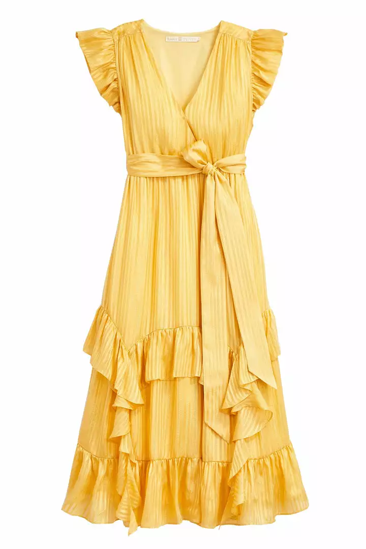 Featuring delicate design details like the silk lurex fabric, flattering v-neck, and ruffles along the skirt and sleeves as well as an elastic waistband, the Uma Dress exists at the intersection of comfort and style, and comes in a deep yellow ochre for spring.