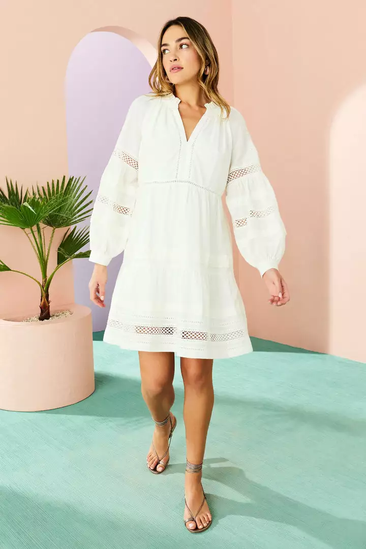If you ask us, you can’t own too many little white dresses. But if you’re only going to wear one this season, let it be Sheridan. With mixed trim, neat pleats, full lantern sleeves, a flattering v-neck, and a flirty skirt, this slip-on silhouette wows from spring to summer.
