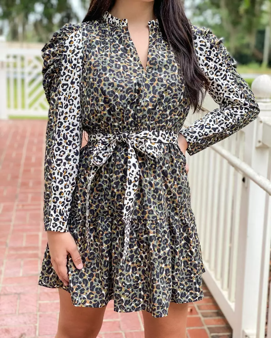 With the same full dramatic sleeves as our Eden blouse, the Vienna dress in our earthy Forest Chita print makes a bold statement for fall. A contrasting belt pulls together the look.