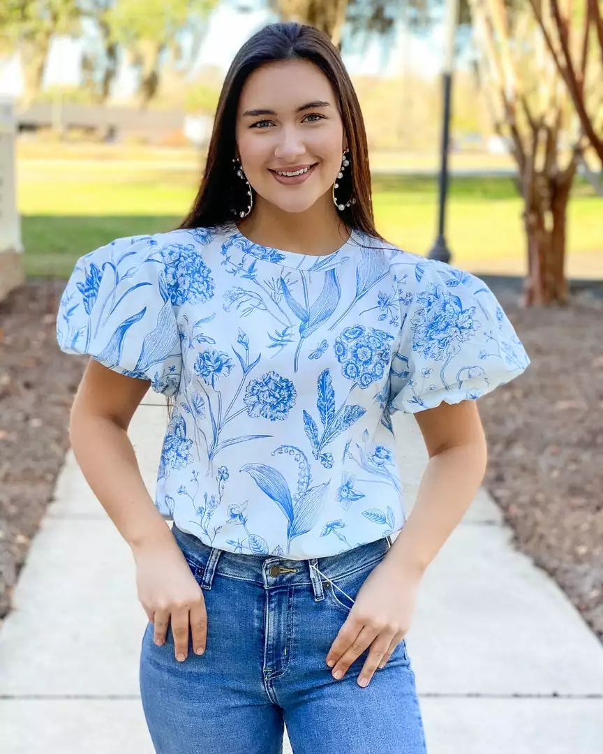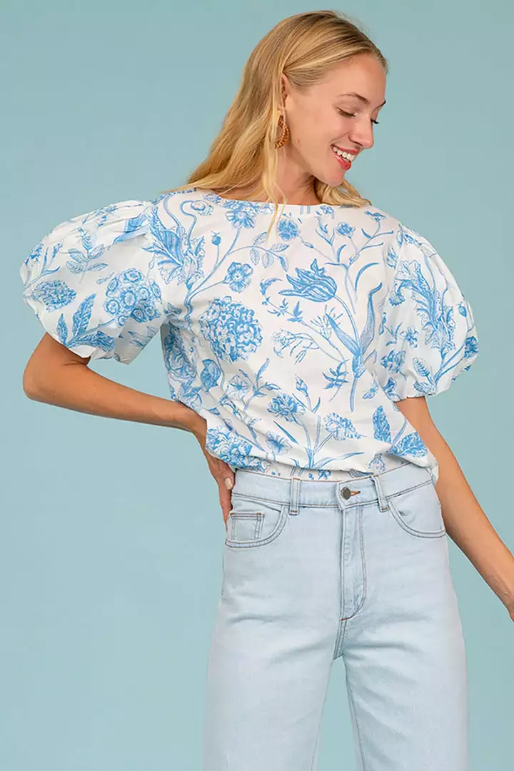With her on trend voluminous puffed elastic sleeves, round collar, and back button details, our Annie Top, will give your Spring wardrobe an instant update. She looks super chic worn either loose or tucked in to jeans or skirts. Shown here in our Toile Sky print.