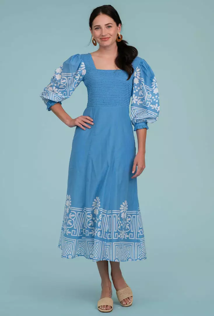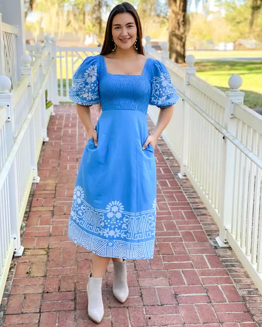 With her flattering square neckline and elbow length puffed sleeves, our new Bridget Midi dress is a modern interpretation of the retro Renaissance style. She has a smocked bodice and cuffs, and flirty gathered midi skirt with side pockets. Shown in our Garden Gate Sky print.