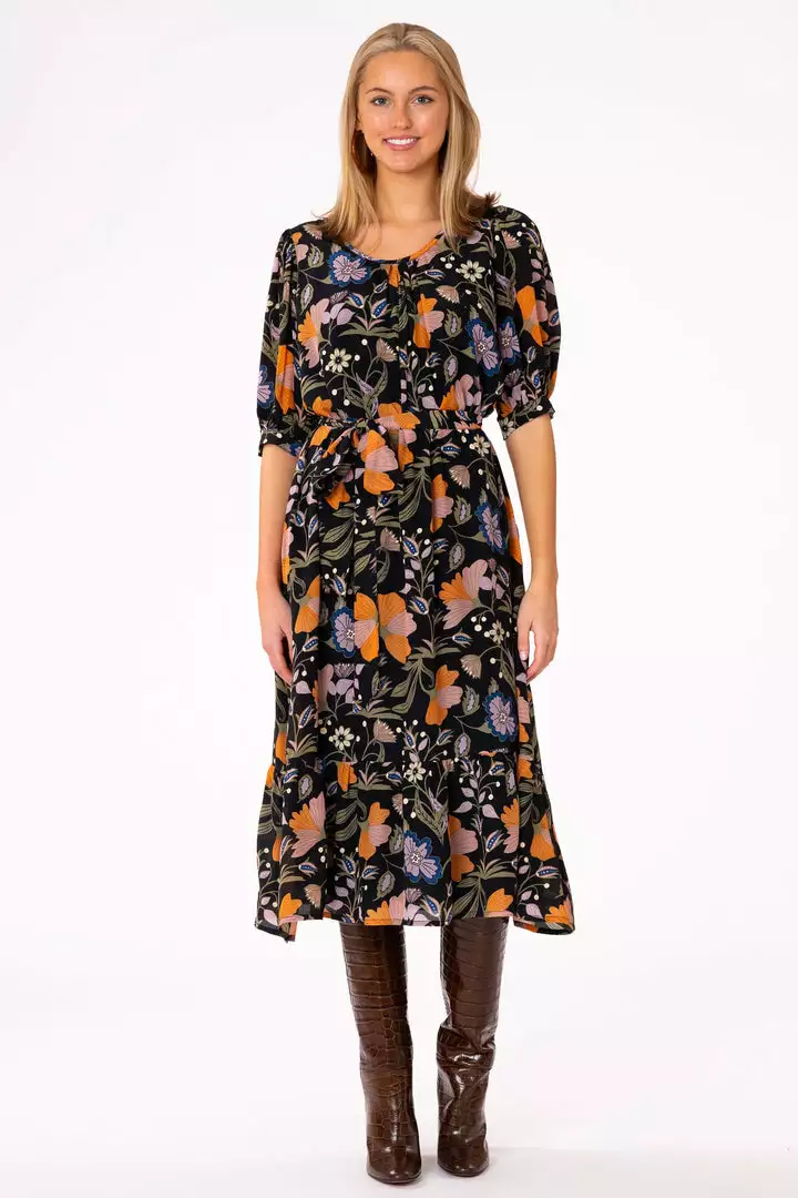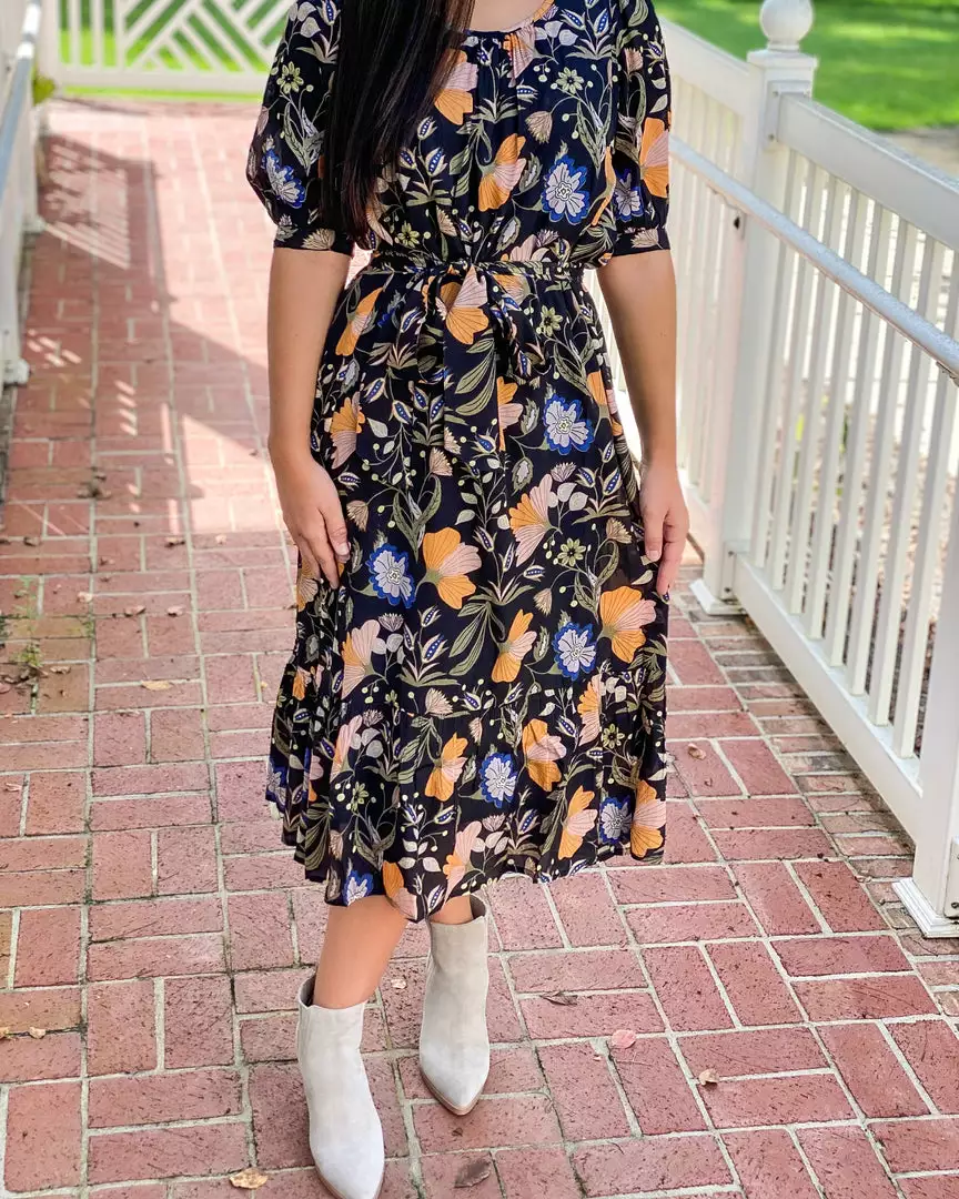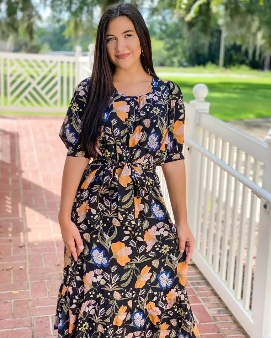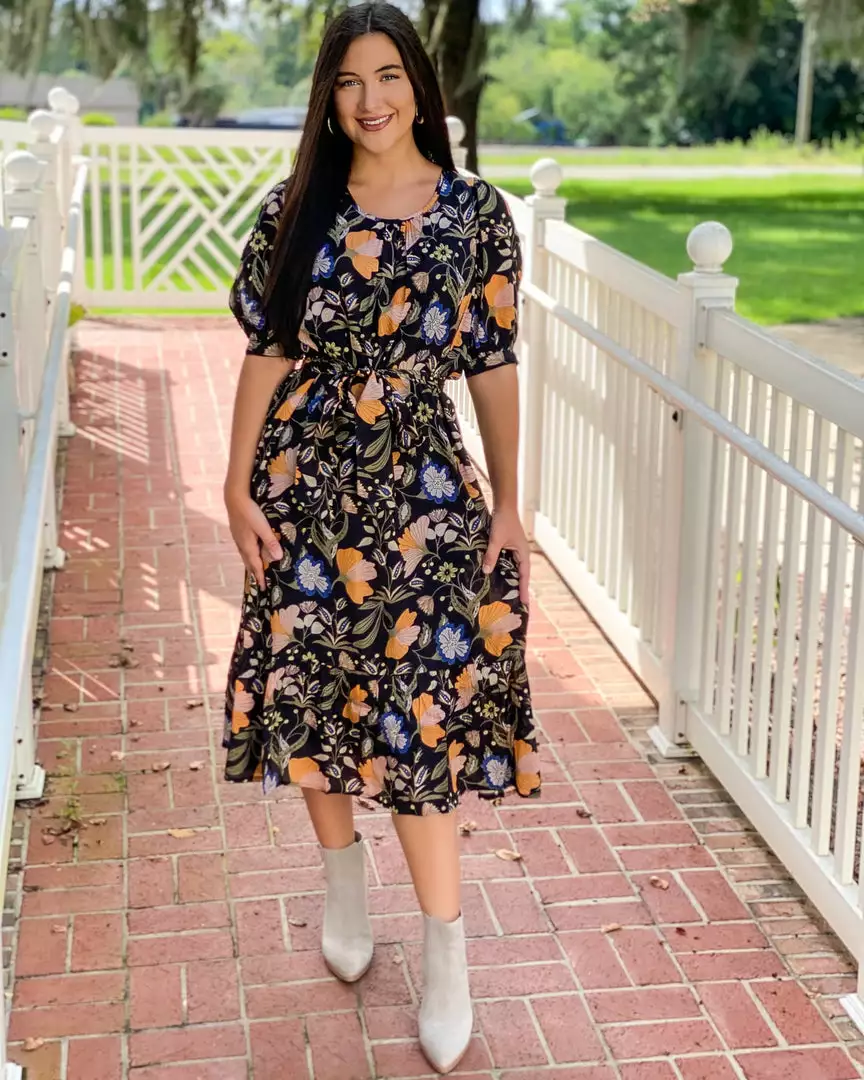 Our classic Molly Dress has gotten a fun update for Fall. With her slightly puffed sleeve, shifty body, optional waist tie, she’s ready to be dressed up or down and taken on the town. Also featuring a high round neckline and side pockets. Shown in Black Fall Floral print.