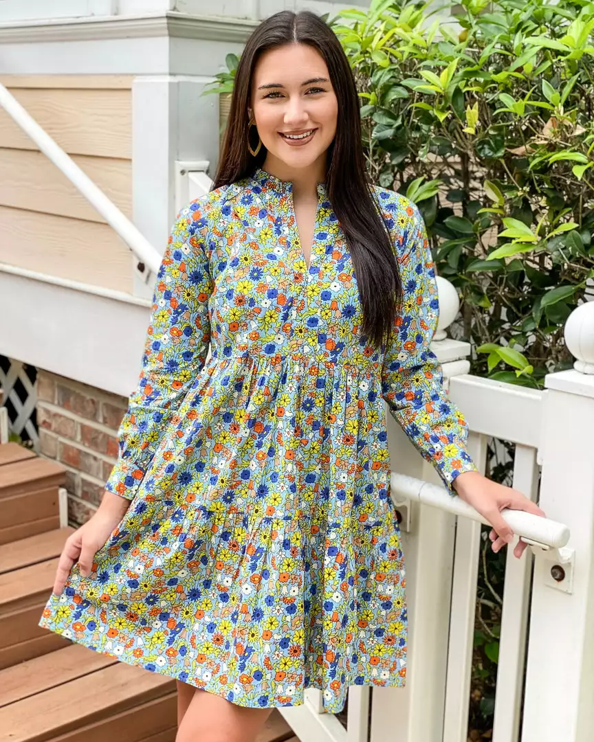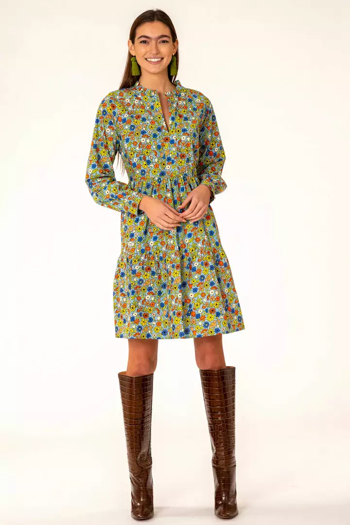 The Waverly Dress is a flattering v-neck, tiered knee length style with long cuffed sleeves and side seam pockets. The perfect go anywhere dress that looks great with boots in the Fall and flats or sandals in warmer months. Shown in our Dusk Liberty print.Â
