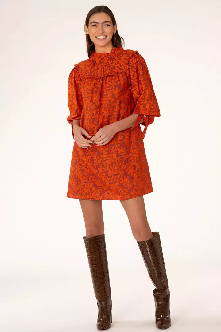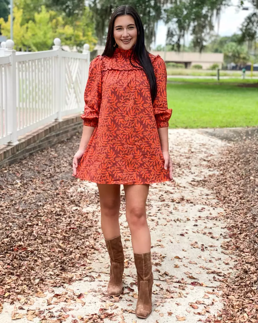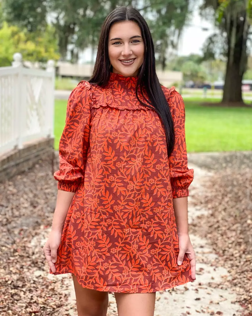 The Emma Dress makes a statement with her high ruffle neck and pretty ruffle bodice details. Full long sleeves with elastic cuffs that can be worn pushed up for a three quarter length look make this dress a season-less favorite. Style yours with boots this Fall and everything from sandals to sneakers in warmer weather. Shown in Harvest Stems print.