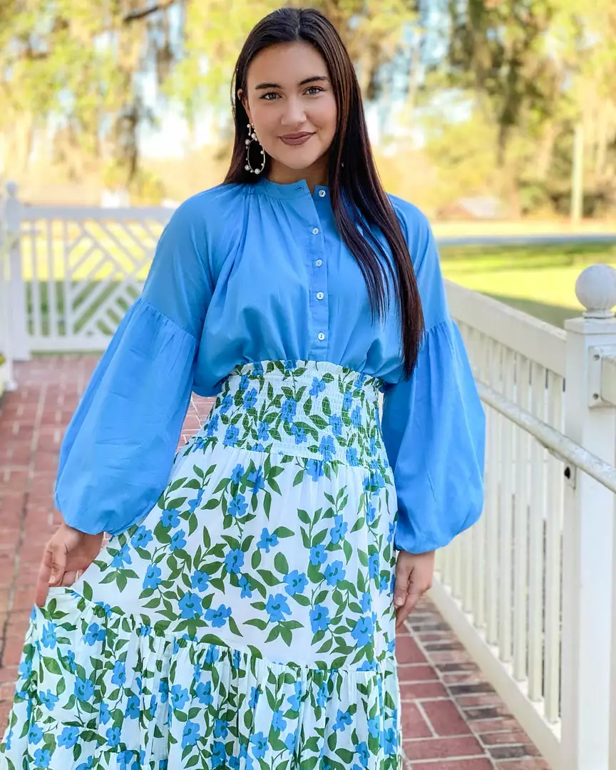 Meet the Boho chic button down every closet needs. With her gathered mandarin collar, dropped shoulder, and dramatic full sleeve, our new Emory blouse will elevate your look by adding a modern edge to jeans, trousers and skirts. She has elastic cuffs for an easy fit and looks great dressed up or down. Shown in Sky.