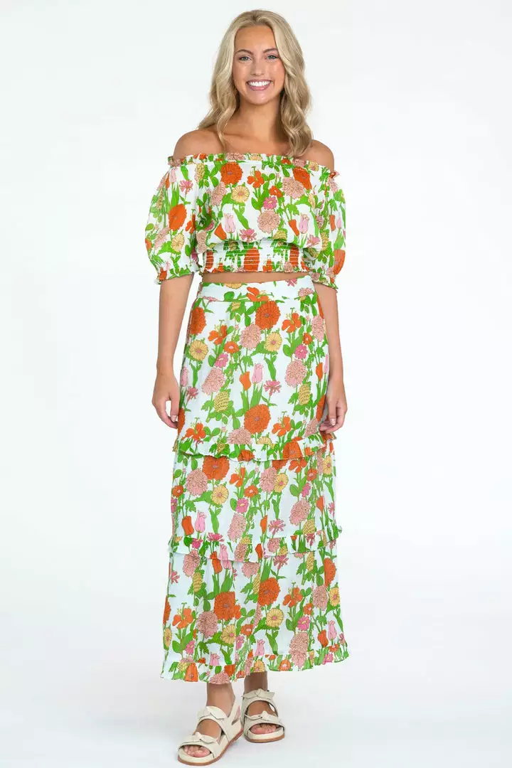 Our favorite maxi skirt is back for Summer. Featuring an elastic waist and ruffle trim, she skims the hips for a flattering fit. Shown in Mini Mod Floral Melon.