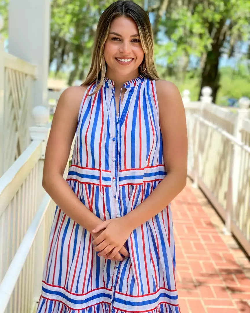 The Ro Dress will be your go-to maxi from spring days to summer nights. With its standing ruffle collar, button front, and tiered body with side pockets, it is the perfect combination of elegant and breezy.