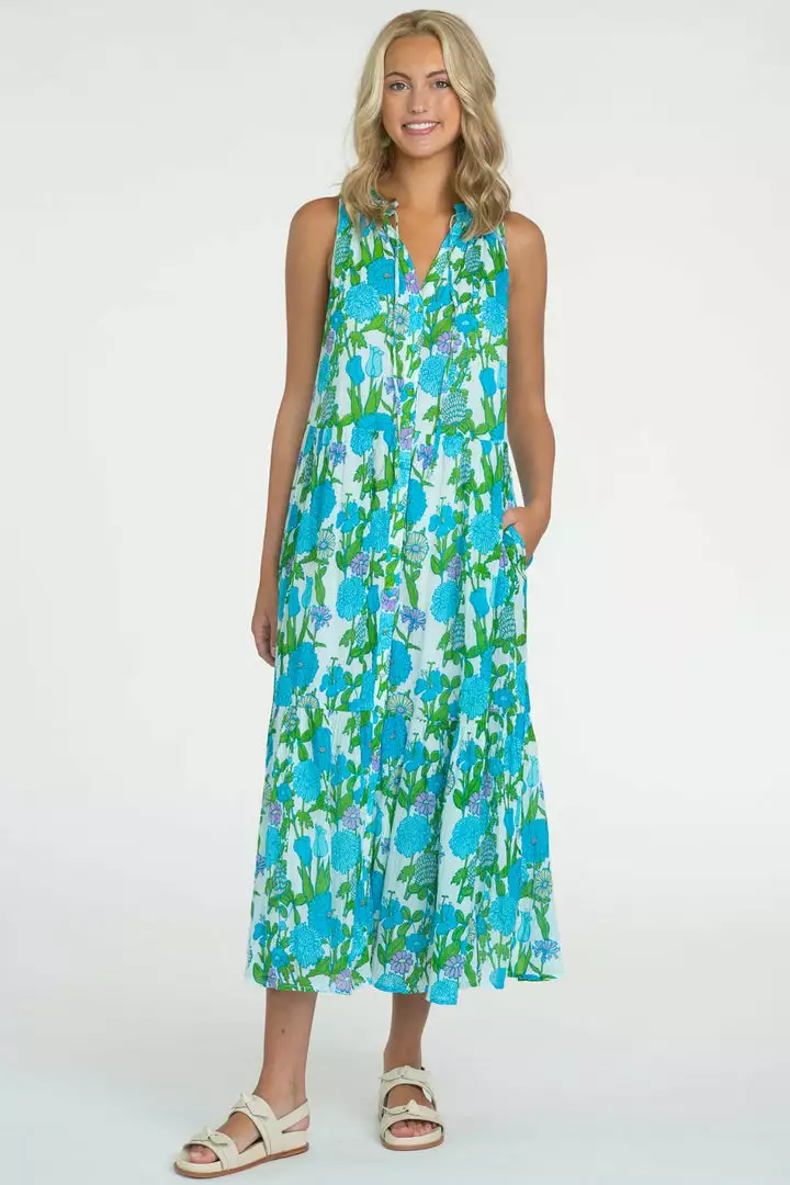 The Ro Long Dress will be your go-to maxi from spring days to summer nights. With its standing ruffle collar, button front, and tiered body with side pockets, it is the perfect combination of elegant and breezy. Shown in our Mini Mod Floral Aqua print.