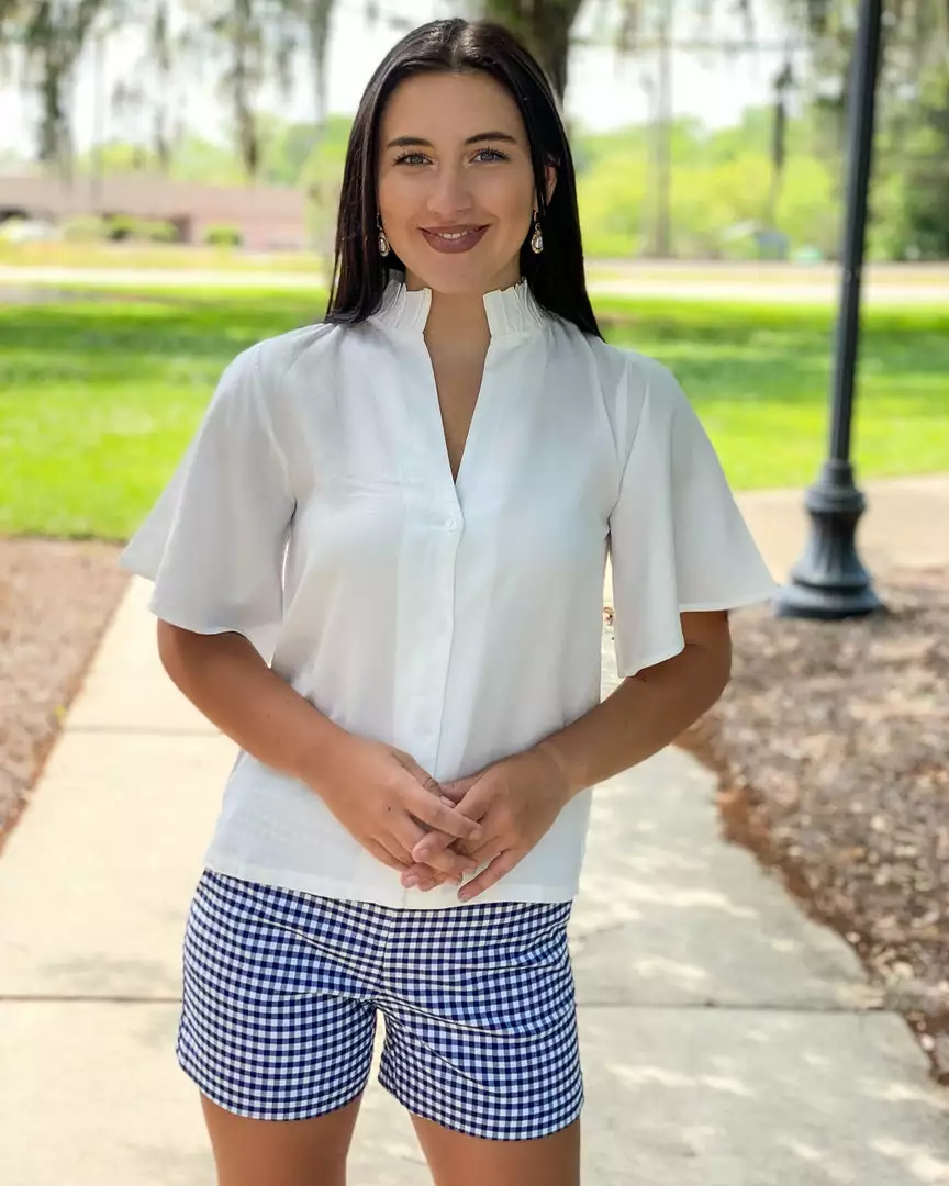 - V-neck button-down blouse with a short flutter sleeve and ruffle at the collar.
