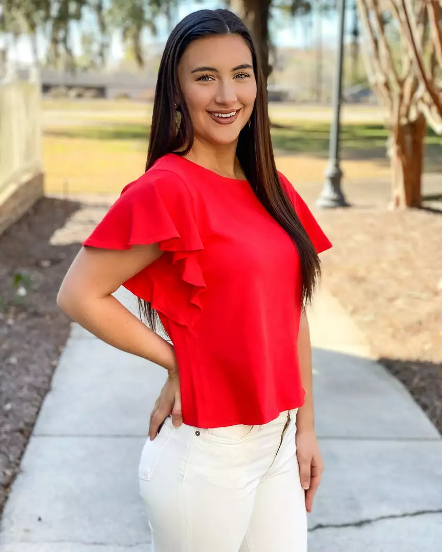 - Boat neck ruffle short-sleeve top in our cotton slub.