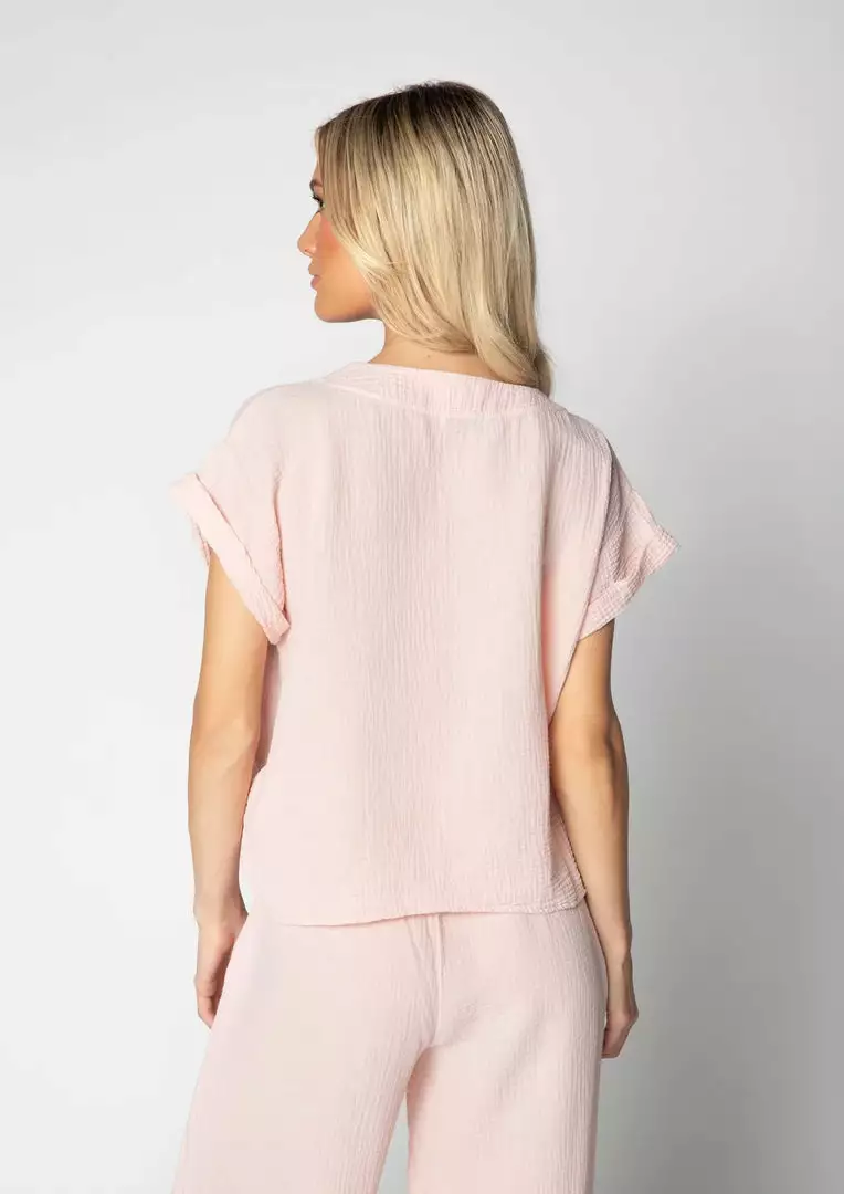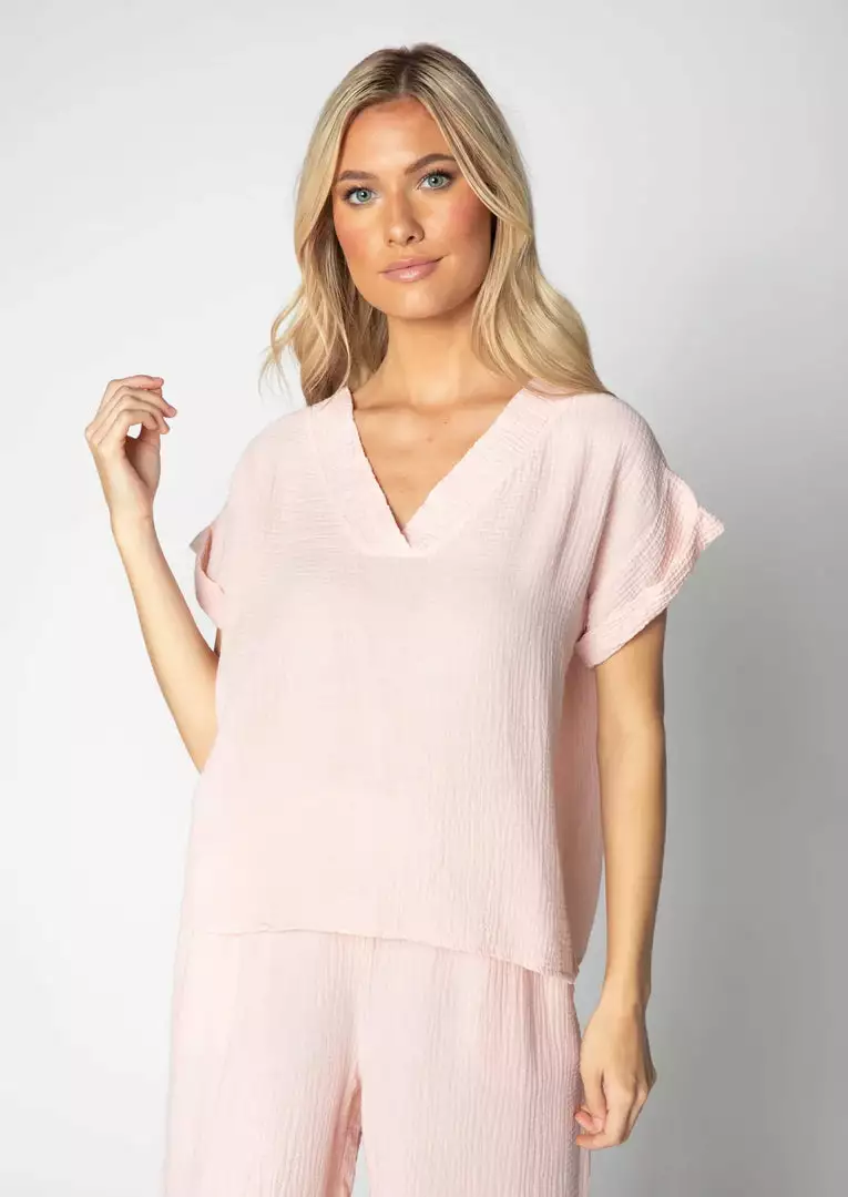 - V-neck relaxed fit gauze top with rolled sleeve.Â