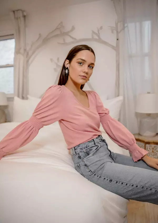 - V-neck long sleeve top in our cotton slub with smocking on the sleeves.