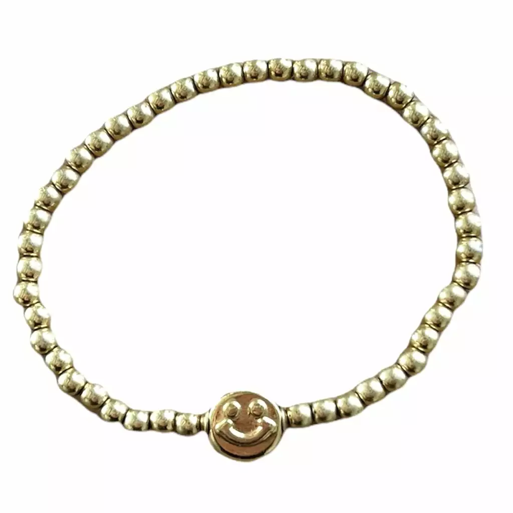 Handmade in Brazil. Keep it Merry and Bright with this Elastic 18K Plated Gold bead bracelet. Embellished with a Smiley Bead and Polished to a brilliant shine to wear alone or stack with any of our Merry Go Round Elastic pieces. Durable Elastic to easily slide on and off your wrist!Â
